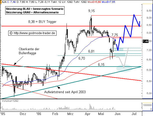 Rückblick: Die ANALYTIK JENA Aktie (Nachrichten/Aktienkurs) brach nach einer elfmonatigen Aufwärtsbewegung im April 2006 kurzzeitig über die 8,38 Euro Marke als mittelfristigen BUY Trigger aus, fiel aber unmittelbar wieder darunter zurück und neutralisierte das entstandene Kaufsignal wieder. Eine Abwärtskorrektur bis an den zentralen Unterstützungsbereich bei 6,64 - 6,81 Euro war die Folge. Dort prallte die Aktie dynamisch nach oben hin weg und notiert aktuell am Kreuzwiderstand bei 7,65 - 7,75 Euro.