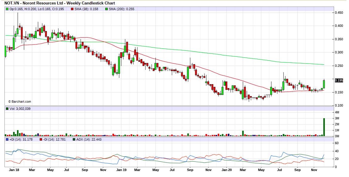 Aber: Jetzt gibt es einen Befreiungsschlag beim Kurs, nach 10 Jahren Verbilligen ist mein break-even da ... und er entspricht in keiner Weise irgendwelchen Fortschritten beim Projekt! Es gibt genug andere Nickelprojekte in Kanada, die in der Entwicklung m.E. auf der Überholspur gegenüber Noront sind, und die das Problem der Straßenanbindung nicht haben. CanadaNickel hat neuerdings sogar auch Chrom, sagen sie, das ist mir stark aufgefallen (vorsicht, die Machbarkeitsstudie käme erst in einem Jahr, aber sogar damit könnten sie evtl. Noront noch überholen). Noront versteift sich darauf, die Abbauprodukte von Eagle's Nest mit LKWs Hunderte von km nach Süden zur Verarbeitung schaffen zu wollen, da kann man doch nicht damit kommen, das Nickel müsse entwickelt werden weil es so wichtig für umweltfreundliche Batterieautos sei. Für das Nickel allein würde man vielleicht sowieso nicht so viel Straße bauen. Der Angelpunkt ist mE das große Chromerzvorkommen, für dieses lohnt sich dann auch die von KWG angedachte Eisenbahnlinie; aber hier ist, anders als bei Nickel und PGE, die Frage ob es überhaupt so dringend gebraucht wird. Der Punkt war bisher nur, dass es in Nordamerika keine heimische Produktion gibt.