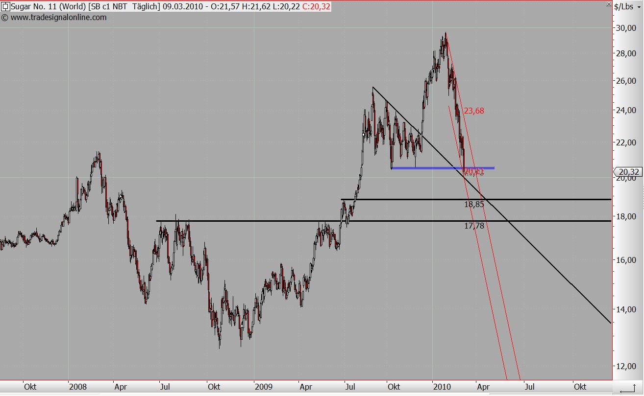 "Longpositionen bei Zucker absichern! Der Markt erwartet ab März 2010 fallende Zuckerpreise (siehe Terminkurve unten), vermutlich wegen besserer Ernteaussichten in den nächsten Quartalen." posting #168