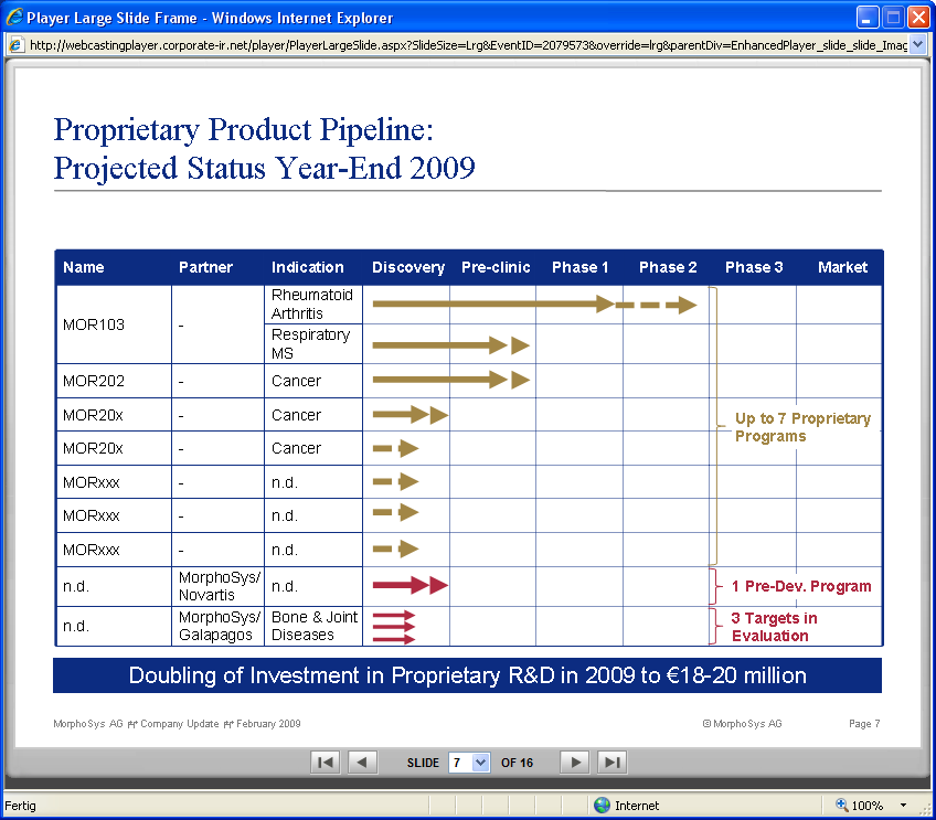 Im Laufe 2010 könnten da Zwischenergebnisse vorliegen. Und 2011 könnten im Erfolgsfalle 20 bis 50 mio Upfront an Morphosys zur Auslizenzierung MOR103 zurückfliessen. Dazu vereinbarte höhere Meilensteinsummen und Tantiemen. Ein Projekt der eigenen Pipeline dürfte wenigstens 2 bis 3 mal so viel Wert sein, wie ein entsprechendes Partnerprojekt, so über den Daumen.