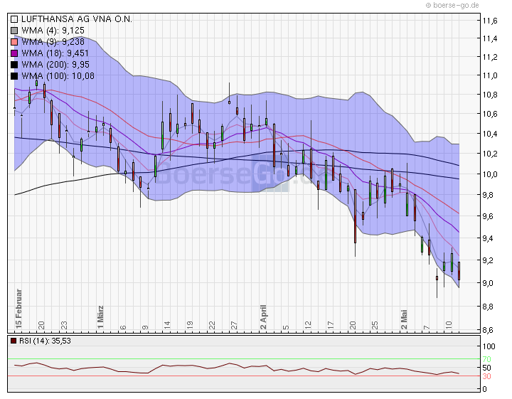 Bei Lufthansa fiel die letzten Tage auf, dass die Höchstkurse täglich niedriger wurden. Ich hatte bei der Deutschen Bank vor zwei Jahren mal ein ähnliches Szenario bei 40 Euro, danach gab es eine Rutsche bis 35,50. Diese Einschätzung lässt zwar keinen Automatismus zu, aber ein gebranntes Kind scheut das Feuer...