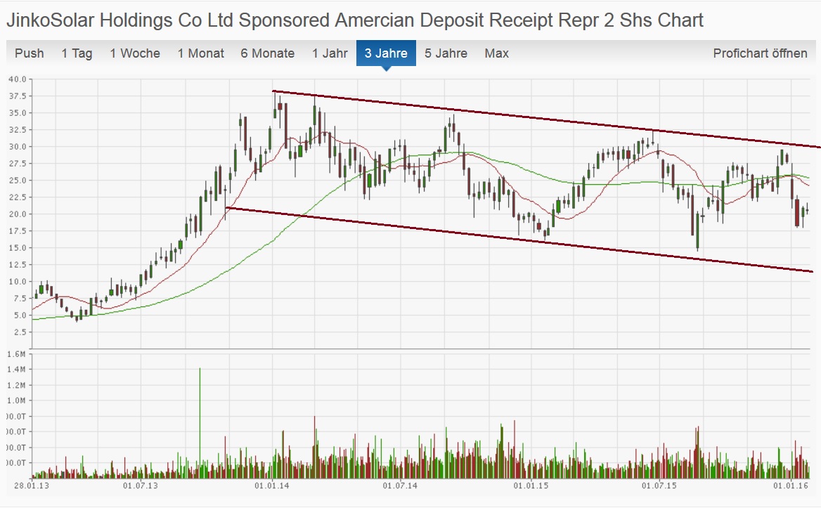 - Aber der Hammer kommt noch. Da wird behauptet, dass Jinko gestern die "ganz klaren" Kaufsignale bestätigt hat. Das haut dem Fass den boden raus. Eine mehr oder weniger unausweichliche technische Gegenbewegung nach einem derartigen Abverkauf hat mit einem Kaufsignal rein gar nix zu tun! Zur Info der 3-Jahres-Chart unterhalb! Jinko befindet sich seit seinem hoch vor 2 Jahren bei 38USD in einem absolut stabilen Abwärtstrend und alle versuche diesen zu Verlassen sind klar gescheitert und es folgten meist sogar neue Tiefs im Anschluss. Jinko (sowie die meisten wichtigen Indizies der USA/Welt) notieren klar unter Ihren Hochs und unter vor allem unter allen wichtigen gleitenden Durchschnitten. Und nun bei einer techn. gegenbewegung von klaren kaufsignalen zu sprechen (Was ja einer Trendwende gleich käme) ist im moment viel zu früh und schlicht weg einfach falsch! Sicher "kann" der Kurs auch von heute an zu neuen Höchstständen steigen...das ist börse...aber die Wahrscheinlichkeit (und nur danach geht es) ist gering....und ein Kaufsignal dafür gab es bislang ganz einfach nicht!