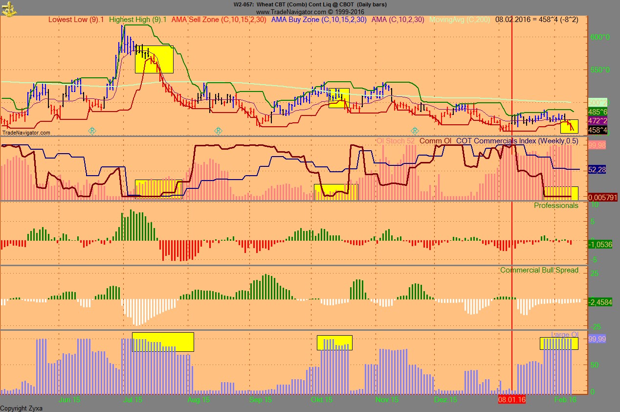 Weizen: Bei Weizen stehe ich momentan noch an der Seitenlinie. Weizen hat auch fallenden GD Noch kein seasonaler Support Wie Birger Schaefermeier sagen wuerde....."Ein schmutziger Chart", also keine guten Ausbrueche, eher ein leicht abwaerts, bzw. seitlicher Markt. ABER die Commercials sind bereits in Lauerstellung und haben sich mit Longs eingedeckt. Darum werde ich bei Weizen ein hoeheres Hoch abwarten und keinen Ausbruch traden. Das bedeutet, ich lasse Weizen erst einmal ausbrechen (wenn er es denn tut) um dann den Pullback in Bereich von ca. 470 kaufen, das ist etwa der Bereich vom letzten Hoch.