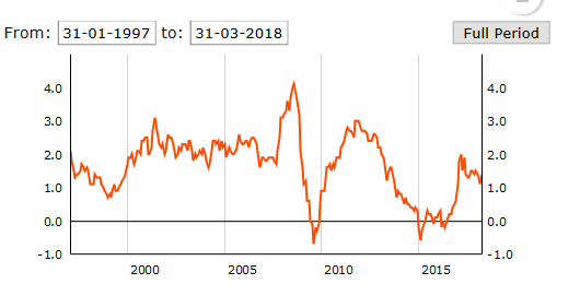 Da die offizielle Inflationsrate für die Eurozone im Zeitraum Mai-Juli 2017 signifikant abstürzte, siehe den beigefügten Chart dazu, dürfte es in den vor uns liegenden Monaten wohl relativ einfach werden, diese Werte zu übertreffen. Und bitte dabei nicht vergessen, wo sich im letzten Jahr die Ölpreise befanden, denn die Sorte Brent notiert mittlerweile über 25 US-$ höher als im Juni 2017.