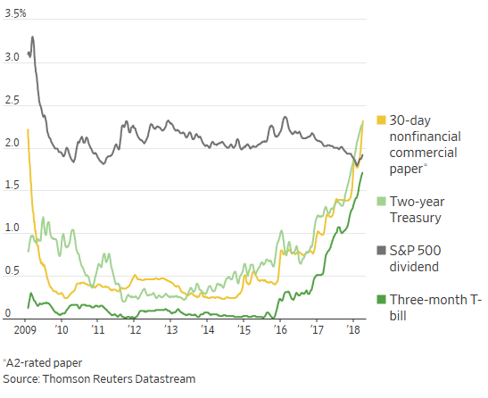 Die Zinsen für kurzfristige Geld-Anlagen in den USA sind in den vergangenen 12 Monaten massiv angestiegen und haben die Dividende des S&P500-Index teilweise bereits deutlich überholt. Aus dem Wall Street Journal dazu: