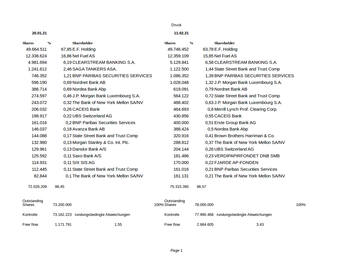 · Successful completion of NOK 290/EUR 27 million private placement at NOK 22 per share and subsequent admission to trading on Oslo Børs' Euronext Growth on 29 October · Acquisition of two hydrogen fueling stations and distribution assets in Norway from Uno-X · Purchase order for six hydrogen trailers designed exclusively to Everfuel specifications · Agreement with Nel for joint development of the Norwegian hydrogen retail and truck fuel market and creation of Everfuel Norway retail AS · EUR 20.7 million loan from EIB to scale and commercialize hydrogen fuel in Denmark and Europe · Acquisition of Danish Hydrogen Fuel A/S (DHF), adding four hydrogen fueling stations in Denmark · Award of contract for 20 MW alkaline electrolyser for green hydrogen production in Fredericia · Year-end cash position of EUR 23 million · Completed NOK 600/EUR 58.5 million multiple times oversubscribed private placement at NOK 125 per share in January 2021