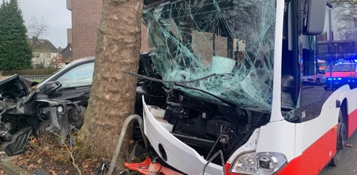 Gladbeck. Ein Linienbus ist in Gladbeck auf der Schwechater Straße mit zwei Autos und einem Baum kollidiert. Mehrere Insassen und der Fahrer verletzten sich.