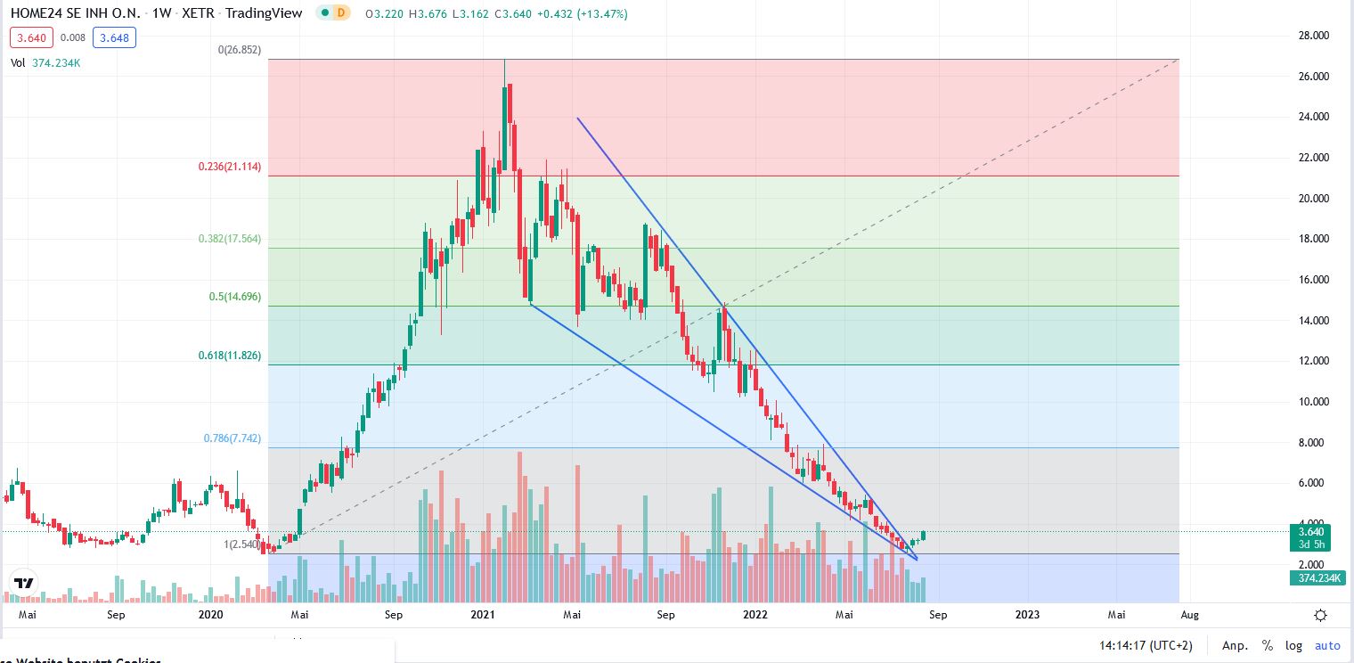 Man kann viel rechnen und befürchten, man muss aber mal klar sagen, dass die Bewertung aktuell kein vernünftiges Chance Risiko Verhältnis zeigt, sondern eigentlich nur Risiko. Und Rendite kommt von Risiko. Damit ist klar, glaube ich langfristig an diese Unternehmensidee, dann habe ich hier die Chance auf hohe Rendite. Oder aber ich bin extrem skeptisch, nun dann brauche ich nun auch nicht mehr skeptisch, dann war ich hoffentlich bis hier hin short, denn noch weiter macht kaum Sinn, da Home24 nicht dieses und vermutlich auch nicht nächstes Jahr Pleite geht. Und dann habe ich bis hier her, sehr richtig gelegen und weiter macht auch aus der Shortsicht, vom Chance Risiko Profil, kaum mehr Sinn. |