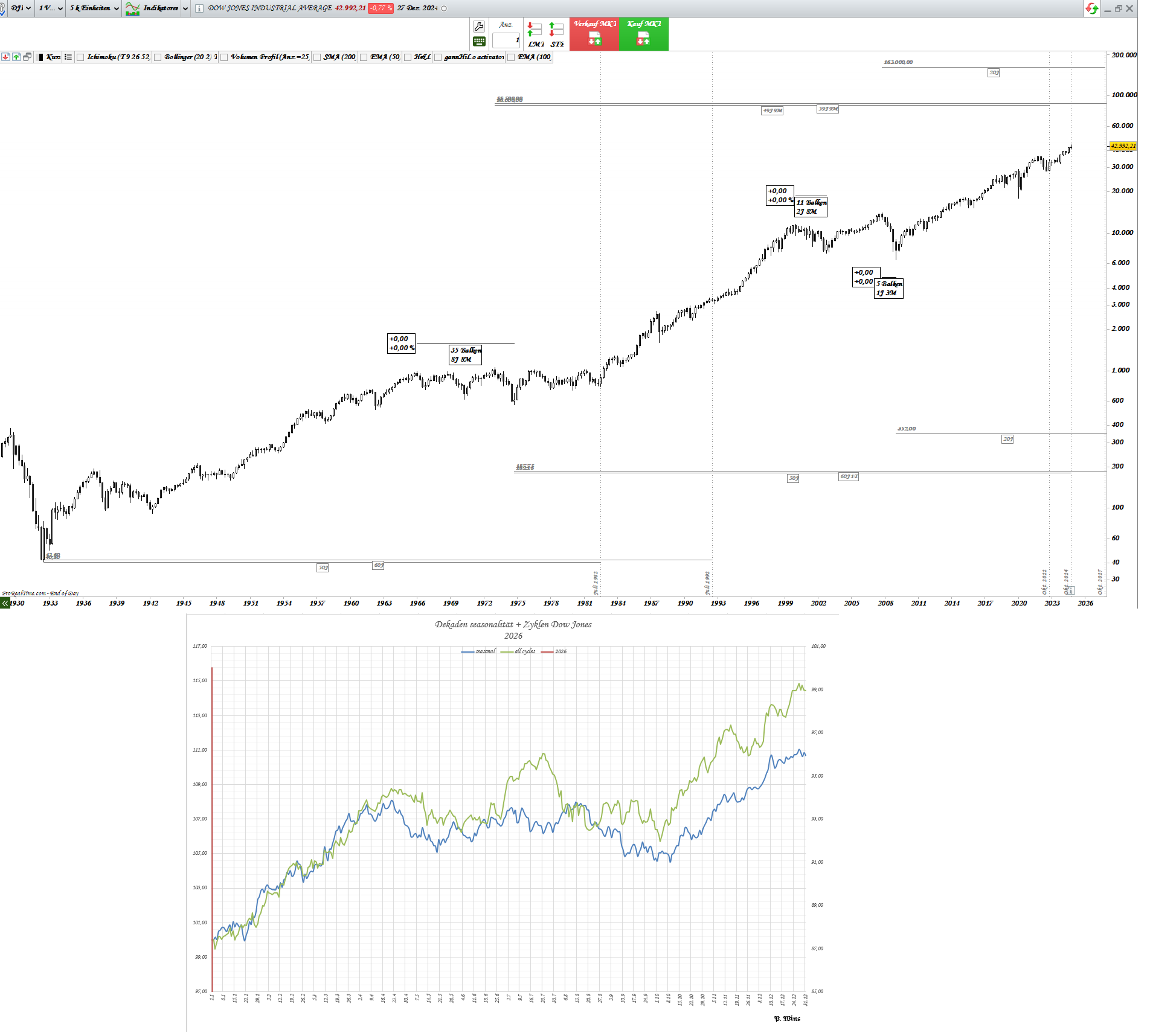 „All cycle Dow Jones“ besteht aus vorher berechneten kurzfristigen und langfristigen Zyklen.