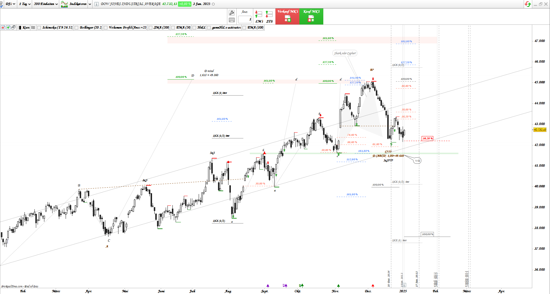 Allerdings ABC (Tief Okt 2023 -> Hoch März 2024 und Tief Apr. 2024) wurde lediglich das mind. Kursziel erreicht. 1,618 der Projektion liegt bei ca. 49.860.
