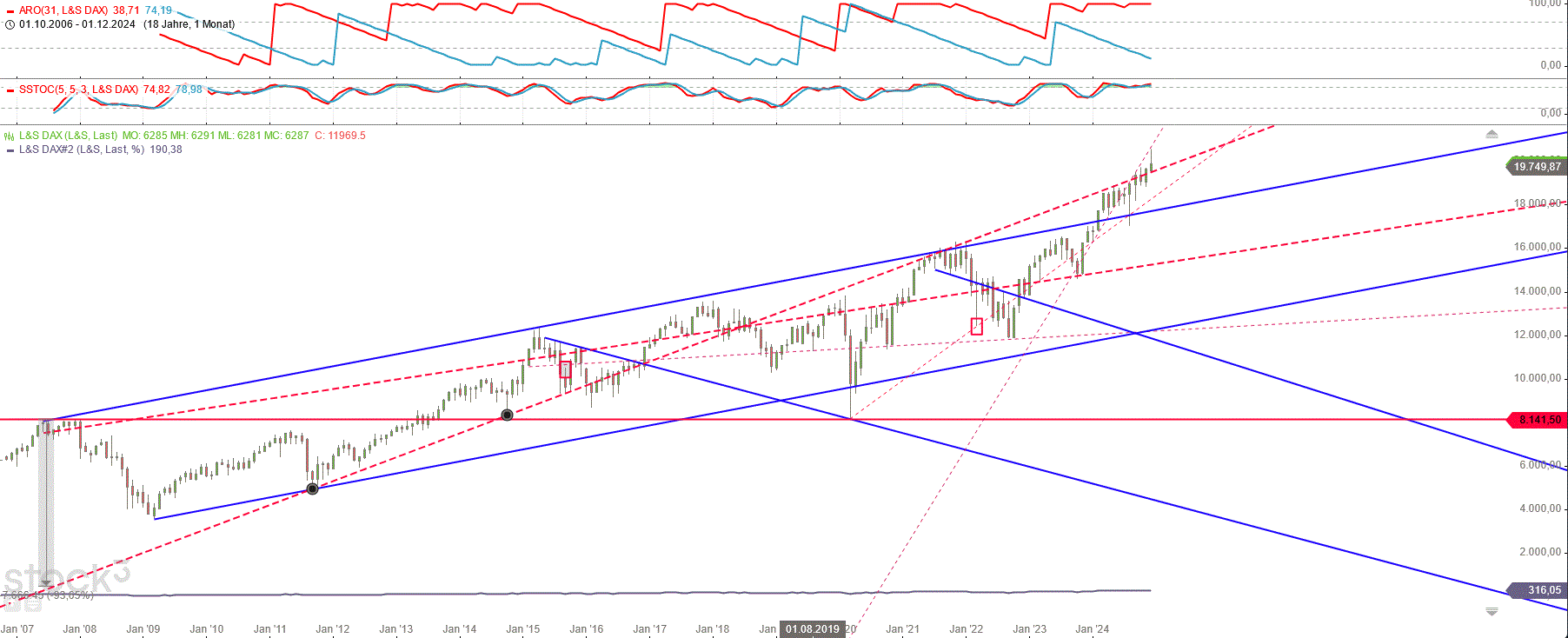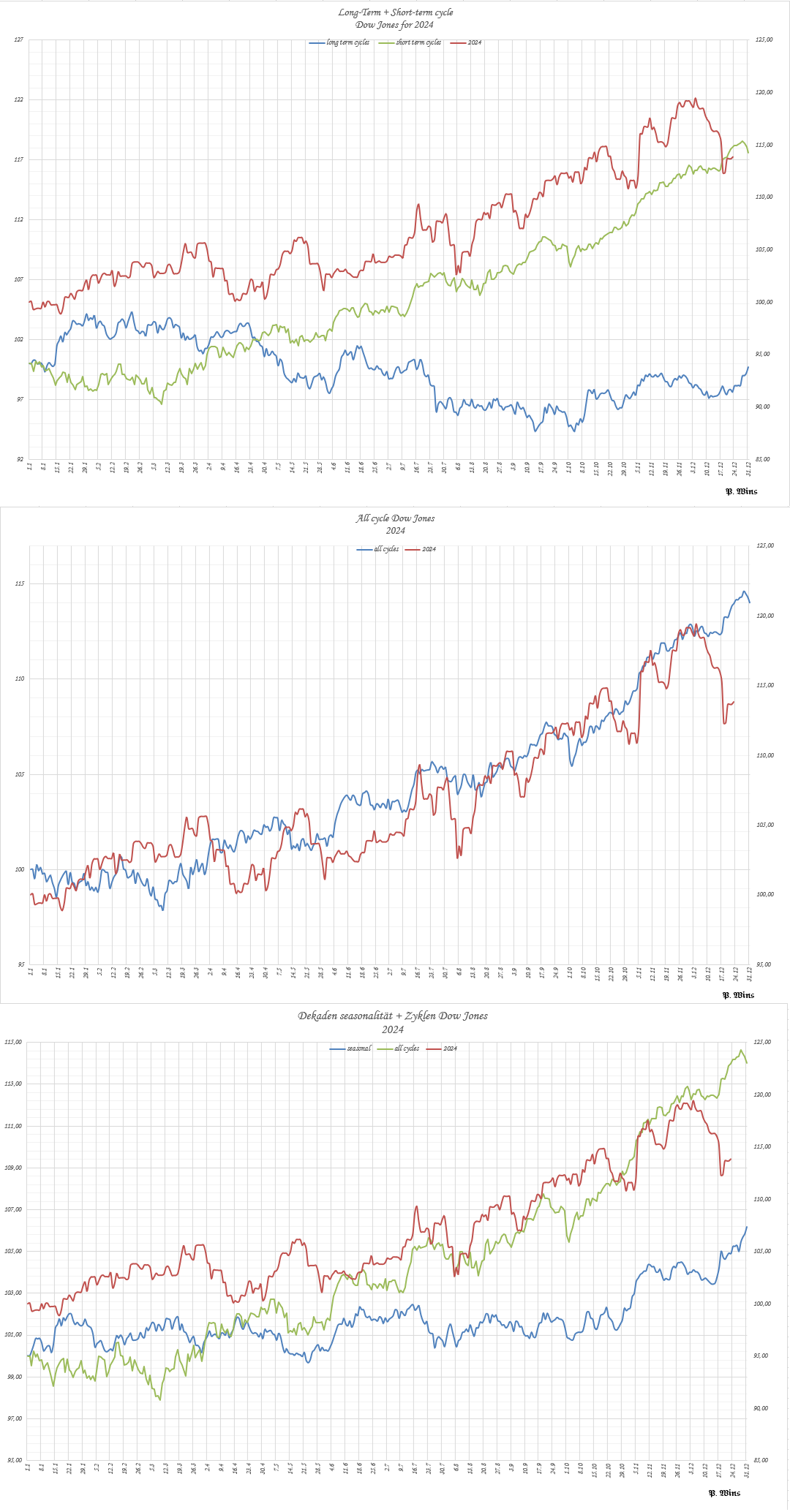 Wie vermutete war die erste Hälfte 2024 eher Seitwärtsbewegung, zumindest Juli. Dow schaute kurz über Ross Umschlag raus, um dann noch ein Tief Anfang August zu machen. Ab da ging ja die Aufwärtsbewegung los, dem Zyklus folgend. Wobei dem Zyklus in 2024 habe ich im Beitrag nicht getraut, eher der Dekaden Saisonalität.