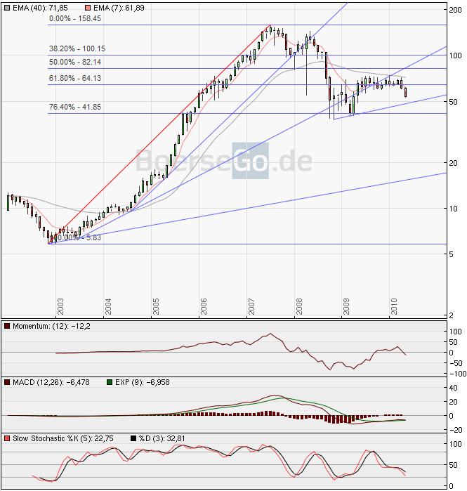 Der Versuch, den Aktienkurs eines Daxwertes allein mit Charttechnik zu analysieren bzw. sogar vorhersagen zu wollen ist "vor die Wand" gedacht. Charttechnik ist natürlich hilfreich, wenn man sie richtig einsetzt, jedoch führt sie haufenweise zu Fehleinschätzungen, wenn man verbissen an ihr klebt.