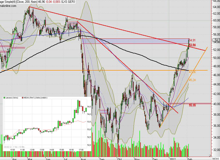"Kaufe die Unterstützungen, verkaufe die Widerstände" laute eine der ältesten Tradingweisheiten überhaupt. Insbesondere Letztere könnte aktuell für die LANXESS-Aktie gelten. Schließlich sei der Chemie-Titel nicht nur überkauft (vgl. RSI), sondern sehe sich gleichzeitig mit einem markanten Widerstandscluster bei rund 47 EUR konfrontiert. Auf diesem Niveau würden die letzten beiden Hochpunkte bei 46,90/47,66 EUR sowie das Tief vom März 2011 bei 47,33 EUR mit der 200-Tage-Linie (aktuell bei 47,55 EUR) und der 50%-Korrektur des Baisseimpulses von Mai bis Oktober 2011 (47,71 EUR) zusammenfallen. Das am Freitag ausgeprägte "bearish engulfing" im Tageschart unterstreiche den Widerstandscharakter der oben genannten Barrieren.