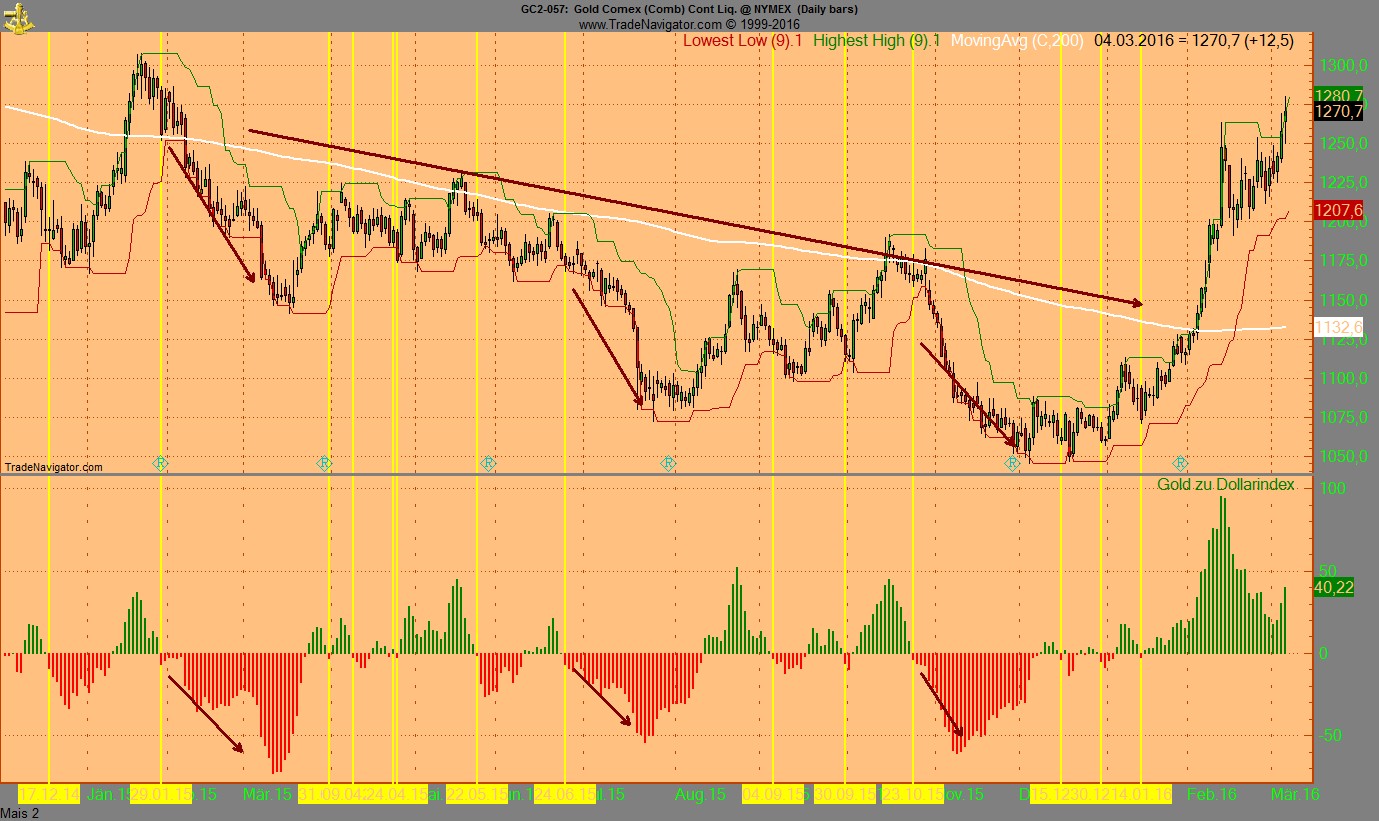 Der Goldpreis und der Wert des US Dollar, eine Beziehung wie Mann und Frau. Mein Spread Indikator, der den Wert des Goldes relativ zum Dollar betrachtet, zeigt sehr schoen....naja, ihr seht ja selber.........