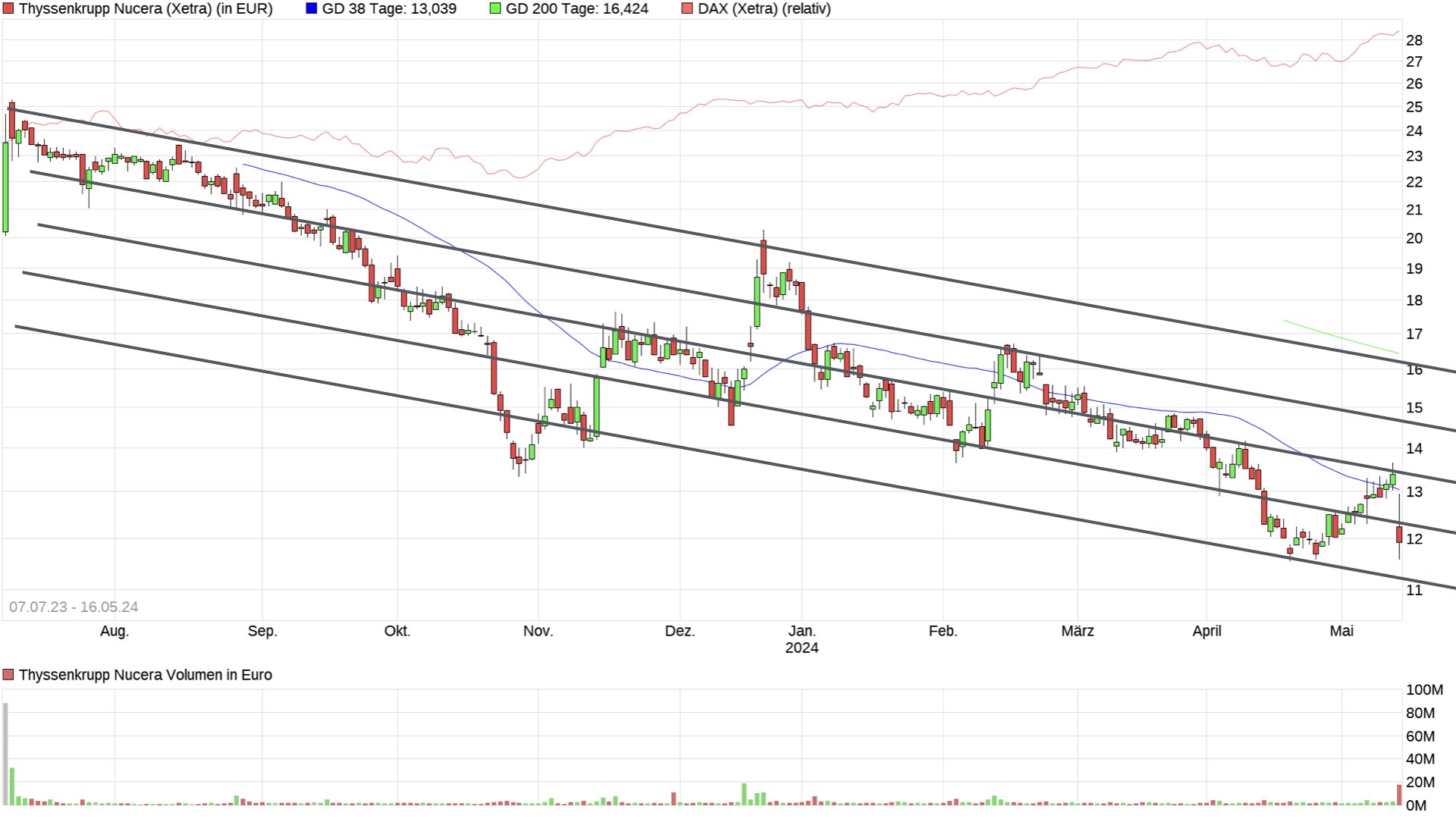 es ist vergeblich darauf zu setzen, dass mit logarithmischen Darstellungen größere Präzision erreicht wird; Präzision gibt es hier nicht. Ich denk übrigens auch nicht, dass ein Kursverlauf von 100 auf 50 dasselbe bedeutet wie einer von 10 auf 5. Wichtig ist, ob es überhaupt einen Trend gibt, wie ein Kanal aussieht, und vor allem auch, wieviele Leute bei einem bestimmten Wert im Gewinn sind. Wegen letzterem gilt dann: Horizontale Linien sind wichtiger als schräge Linien :) Ich staune immer, wenn es eine schräge Linie gibt, die Erklärungskraft zu haben scheint. Meine Erfahrungen mit meinen Gemälden sind aber durchaus positiv, sonst würd ich es nicht seit Jahren so machen. Wie gesagt, man kann nur robuste Aussagen gebrauchen, und das sind solche, die nicht von der Darstellungstechnik abhängen. Und als Mensch schaue ich einfach lieber auf lineare Skalen. Ich weiß schon dass der Handel sonst von Programmen & Maschinen gemacht wird. Aber man wird ja sowieso immer veräppelt! Gestern war es so, dass ich "Nucera 11,00" auf meinen Einkaufszettel eingetragen hab, zunächst ganz intuitiv, und als ich dann den Chart zeichnete, war ich amüsiert, dass er auch genau auf 11 zeigte. Ich betreibe die Mustersuche aber unvoreingenommen. |