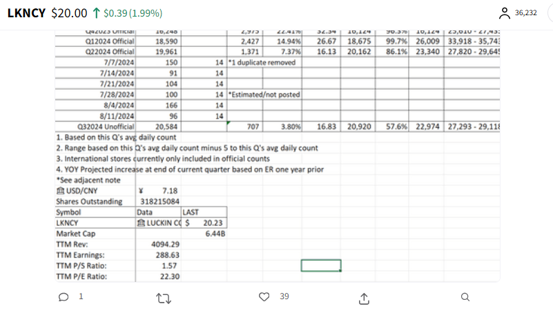 Die Gewinne von Luckin Coffee im 2. Quartal 2024 zeigten ein starkes Wachstum, wobei der Umsatz im Vergleich zum Vorjahr um 88,7 % auf 6,20 Milliarden RMB (853,6 Millionen USD) stieg. Das Unternehmen expandierte auf über 20.000 cool Geschäfte und fügte 1.485 neue Standorte hinzu. Das nicht GAAP-konforme Betriebsergebnis stieg um 104,8 % auf 764,6 Millionen RMB (105,4 Millionen USD) bei einer Marge von 11,5%. Luckin brachte auch handgebrühten Kaffee in seinen Flagship-Stores auf den Markt, um seine Marke und Margen zu stärken.
