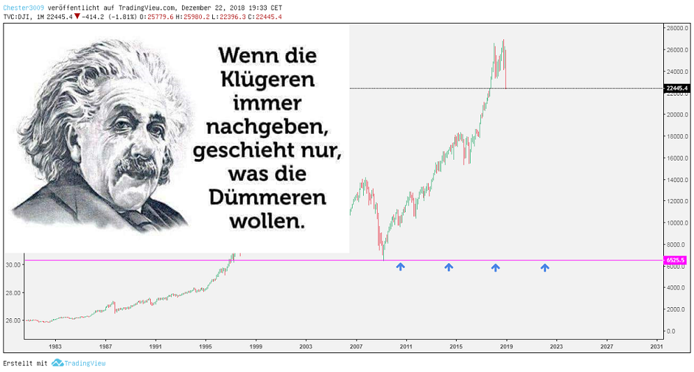 Das bearische Szenario war bereits seit dem 10.12.2018 erkennbar, als der Abwärtstrend vom Jahreshoch bestätigt wurde. Dass allerdings eine solche Abwärtsdynamik noch vor Weihnachten einsetzt, war nicht sehr wahrscheinlich. Aber so ist das eben mit Wahrscheinlichkeiten. Dass wir an der Wallstreet den schlechtesten Dezember seit über 80 Jahren bekommen, hatte sicher niemand auf dem Schirm.