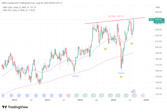 Erst ein nachhaltiger Durchbruch über die Nackenlinie sowie das Kursniveau von mindestens 255,00 US-Dollar (steigend) dürfte bei Analog Devices das favorisierte Kaufsignal auslösen und vorläufige Kursgewinne auf 273,43 US-Dollar ermöglichen, mittelfristig sogar auf 303,97 US-Dollar und würde sich dementsprechend für den Aufbau von frischen Lang-Positionen anbieten. Um ein Fehlsignal zu umgehen, sollten wirklich dynamische Kurszuwächse abgewartet werden, anstatt nur marginal neue Jahreshochs. Sollte Analog Devices auf dem aktuellen Preisniveau jedoch zur Unterseite abprallen, müssten Unterstützungen um 232,92 und darunter der EMA 50 auf Wochenbasis bei 218,66 US-Dollar als Support einspringen.