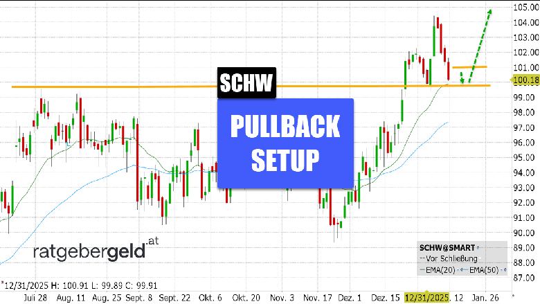 Charles-Schwab–Aktie: Chart vom 09.01.2026, Kürzel: SCHW Kurs: 100.17 USD, Tageschart Quelle: TWS