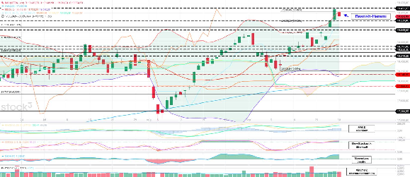 DAX bleibt auf sehr hohem Niveau: Der Trendfolgeindikator MACD zeigt sich heute nun überkauft. Der zweite Trendfolger, der Ichimoku-Indikator ist auch am heutigen Dienstag positiv. Die Slow-Stochastik ist weiterhin überkauft. Ein Verkaufssignal könnte da eventuell folgen. Das Momentum scheint auch am Hochpunkt angekommen zu sein. Die aktuelle Situation wird weiterhin von überdurchschnittlichem Volumen begleitet. Die Bollinger-Bänder vergrößern ihren Abstand weiter. Das Obere Bollinger-Band (19.416) wurde wieder unterschritten. Das Untere Bollinger-Band tendiert bei 18.090 Zähler. Die Markttechnik steht für eine übergeordnete Aufwärtstendenz, allerdings könnten insbesondere Slow-Stochastik sowie die Situation bei den Bollinger-Bändern für weitere Gewinnmitnahmen sorgen.