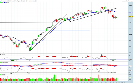 Die nachlassende Aufwärtsdynamik hatte bereits angedeutet, dass der Trend nicht mehr lange zu halten sein wird. Nach den Divergenzen und den Verkaufssignalen bei den Indikatoren kam dann auch folgerichtig der Rückgang. Inzwischen befinden sich die Indikatoren im überverkauften Bereich und stehen vor Kaufsignalen. Die letzten Handelstage haben gezeigt, dass kein Abwärtsdruck mehr zu erkennen ist. Entsprechend könnte der Wochenauftakt erfreulich verlaufen und eine Wende des kurzfristigen Abwärtstrends nach sich ziehen. Dieser Hoffnung steht allerdings der schwache Wochenschluss der Technologie-Börse Nasdaq entgegen.