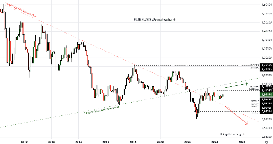 - Kurzfristige EUR/USD Prognose 2024: Vom Hoch aus Dezember 2023 hat der EUR/USD in einer Abwärtsbewegung das Tief aus 2020 angelaufen, wo sich eine Pendelphase um die gleitenden Durchschnitte ergeben hat. In dieser Seitwärtsphase hat sich der Kurs nun deutlich in den 1,09er-Bereich erholt, wo Anschlussdynamik abzuwarten bleibt.