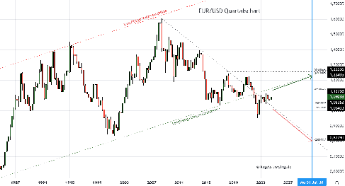 Das dritte Quartal ’23 konnte sich im Hoch bis an die 1,1275 erholen. Damit war die Aufwärtstrendlinie wieder im Spiel, die sich aber als Widerstand entpuppt hat. Sollte der Kurs nachzugeben, wären im weiteren Verlauf bis in das Jahr 2030 Kurse um 0,8000 zu erwarten. Im Gegenzug könnte ein Ausbruchsszenario das Währungspaar zurück über das Jahreshoch aus 2021 führen und Ziele bei 1,2500 anvisieren.