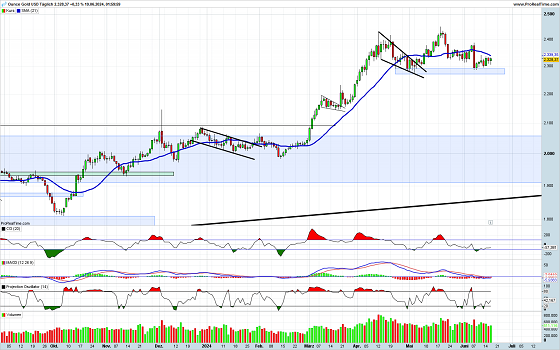Bereits jetzt von einer Trendumkehr-Formation zu sprechen, wie es eine klassische Kopf-Schulter-Formation darstellt, wäre zu früh. Wenn allerdings die Unterstützungszone unterschritten wird, trübt sich die Lage bei Gold deutlich ein. Soweit ist es noch nicht und je länger die aktuelle Seitwärtsbewegung anhält, umso weniger wahrscheinlich wird dieses Szenario. Die im neutralen Bereich notierenden Indikatoren helfen bei der Beurteilung der weiteren Entwicklung derzeit nicht weiter. Die kommenden Wochen werden entscheidend sein.