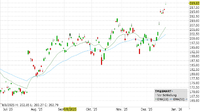 Die Aktie des nach Stückzahlen größten Automobilherstellers der Welt befindet sich ebenfalls in einem Aufwärtstrend mit auffälligen Gap Ups. Im Chartbild sehen wir ein Kursplus von über 29 Prozent. Die fundamentalen Zahlen haben sich auf hohem Niveau stabilisiert. Die Japaner profitieren von der Zolleinigung mit der US-Administration. Im Gegensatz zu den meisten anderen Autobauern hält Toyota an der Wasserstofftechnologie fest.