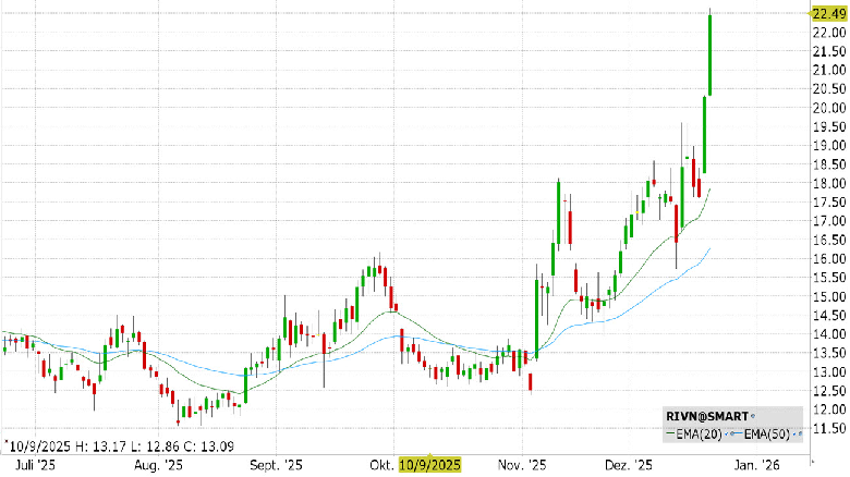 Besonderes Momentum zeigte die Aktie des E-Automobilherstellers Rivian in den vergangenen Tagen, die erheblich zum Halbjahresplus von circa 65 Prozent beitrugen. Das Unternehmen aus dem kalifornischen Irvine hat vielversprechende Projekte zum Autonomen Fahren in der Pipeline kooperiert unter anderem mit Volkswagen und Amazon. Auch wenn die fundamentalen Daten noch tiefrot sind, könnte das Wertpapier bei Rücksetzern für gut abgesicherte Long Trades interessant werden.Optionsmarkt signalisiert Erwartungen weiter steigender Kurse.