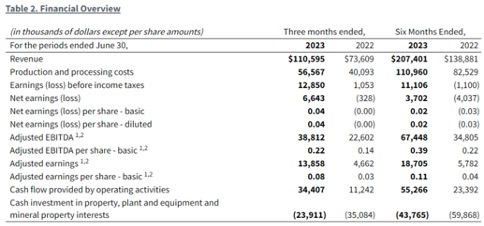 Der operative Cashflow, der Motor des Unternehmens, erreichte im zweiten Quartal 2023 sogar 34,4 Mio. CAD, was einer Verdreifachung gegenüber dem Vorjahreszeitraum entspricht! Gegenüber dem vorherigen Quartal stieg dieser Wert um unglaubliche 65 %. Der kumulierte operative Cashflow in den ersten sechs Monaten des Jahres beträgt rund 55,3 Mio. CAD, und damit mehr als das Doppelte gegenüber dem Vorjahr.
