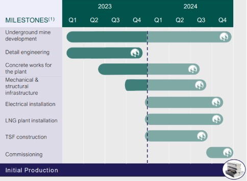 Zu Beginn des zweiten Quartals 2024 steht der Abschluss der Aushubarbeiten für die untere Plattform an, zu der unter anderem die LNG- und Stromerzeugungsbereiche sowie die Konzentrat- und Abraumfiltrationsbereiche gehören. Im selben Zeitraum bis hinein ins dritte Quartal des laufenden Jahres, sind Arbeiten in allen Mühlen- und Infrastrukturbereichen geplant. Den Abschluss bilden die mechanische Fertigstellung und Inbetriebnahme im vierten Quartal.