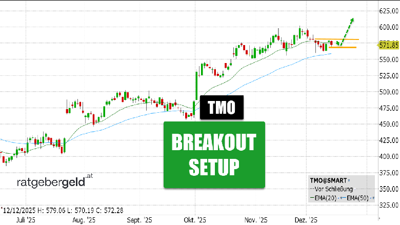 Rückblick: Mit einem Kursplus von 42 Prozent und einer engen Orientierung am 20er-EMA überzeugte die Thero-Fisher-Scientific-Aktie im vergangenen Halbjahr. Zuletzt formierte sich eine Widerstandslinie knapp unter 580 USD. Die Tatsache, dass die letzten beiden Tageskerzen deutlich kürzer waren, sorgt für zusätzliche Attraktivität bei diesem Breakout-Setup.