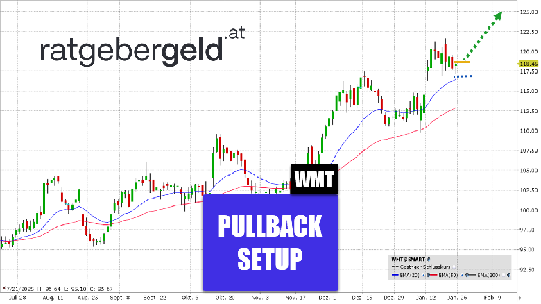 Die Aktie des Superstore-Betreibers befindet sich in einem steilen, intakten Aufwärtstrend. Seit dem Tief im August 2025 bei etwa 95 USD hat das Papier massiv zugelegt. Der Chart zeigt gerade einen gesunden Rücksetzer zum EMA 20.