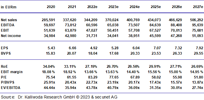 ∎ Auf Basis unseres DCF-Modells leiten wir einen fairen Wert von 339 Euro je Aktie ab. Unser Rating lautet weiterhin KAUFEN.